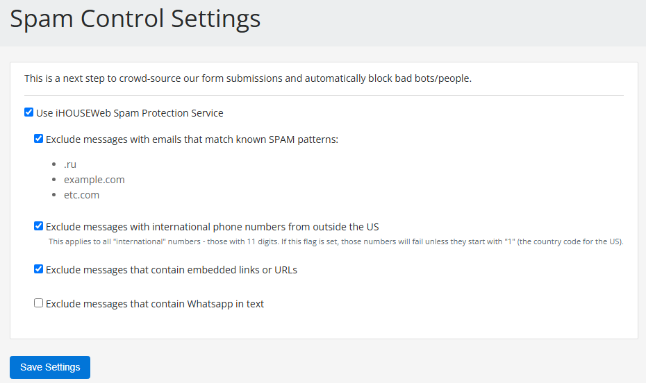 Your Spam Settings help prevent malicious actors from sending you harmful messages. Our Spam Protection Service will automatically block bots and people from contacting you through your form submissions.